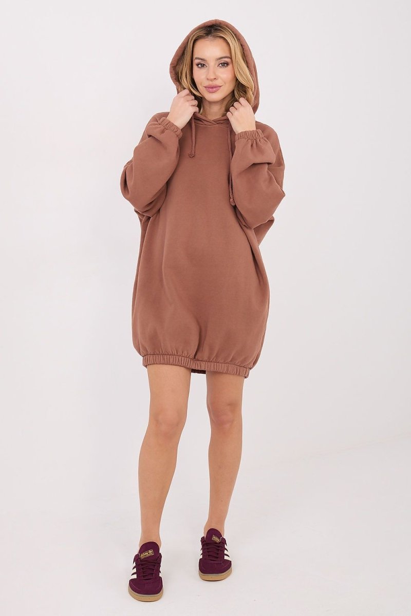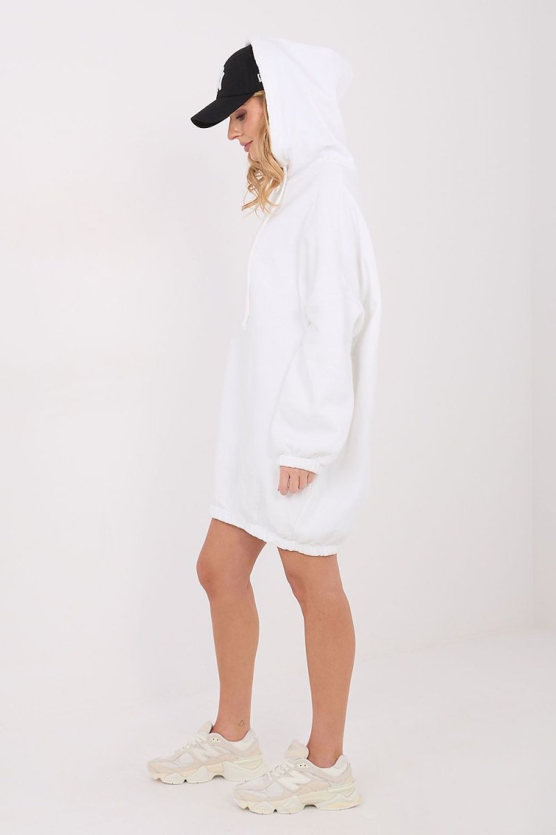 The oversized sweatshirt dress is a comfortable and stylish option for everyday stylizations. Made of high-quality cotton with elastane, it guarantees wearing comfort, flexibility, and freedom of movement. The smooth pattern emphasizes its universal character and makes it easy to match with various accessories. The mini-length model, with long sleeves and a practical hood, is put on over the head. A sewn-in elastic at the bottom gently gathers the dress, giving it a modern look and a slightly sporty character. The insulation provides warmth on cooler days, and the pockets hidden in the side seams increase functionality. An ideal proposal for everyday wear, to be worn with sneakers or boots.