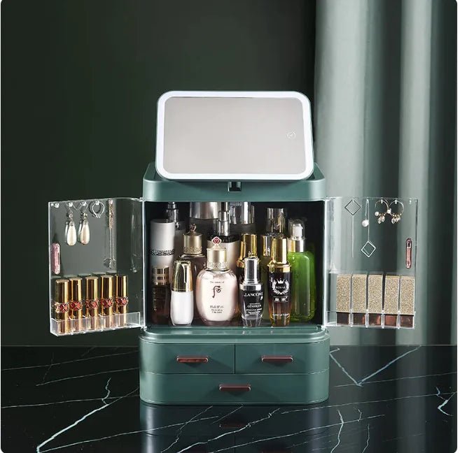 Elevate your beauty routine with the LED Makeup Mirror Box — a sleek, portable solution combining a bright vanity mirror with smart storage. Featuring built-in LED lighting and a spacious interior, this multifunctional makeup box keeps your cosmetics organized and ready wherever you go.